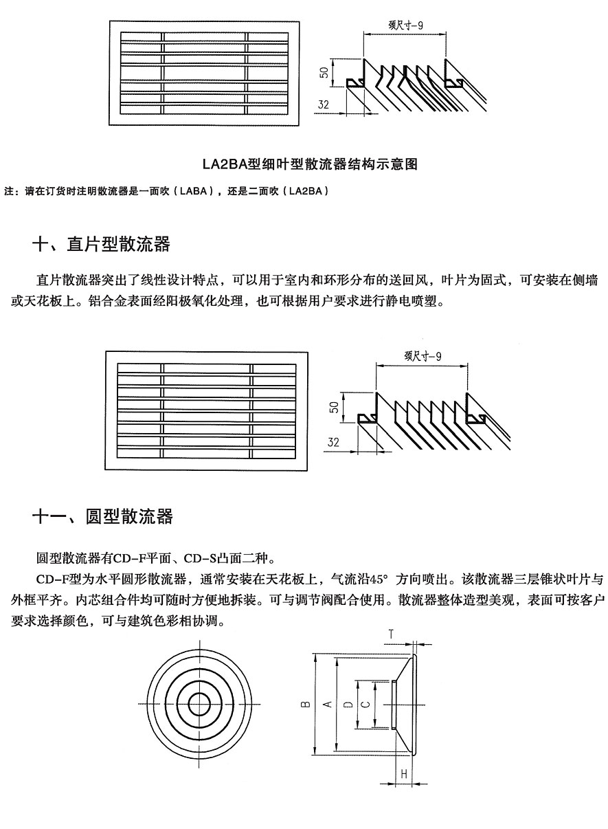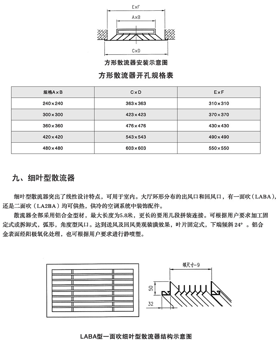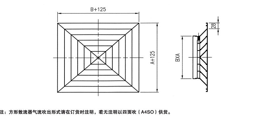 方形散流器線條挺直,表面光潔,葉片角度為固定式,葉片采用夾角片沖壓鏈接,整個(gè)葉片于邊框采用分離式結(jié)構(gòu),以方便安裝于調(diào)節(jié)。設(shè)計(jì)時(shí)可根據(jù)房間造型不同,選用不同出風(fēng)方向散流器,可于調(diào)節(jié)閥配套使用。方形散流器有四種氣流吹出形式,分別為一面吹(A1SO),二面吹(A2SO),三面吹(A3SO)四面吹(A4SO)。鋁合金表面經(jīng)陽極氧化處理,也可根據(jù)用戶要求進(jìn)行靜電噴塑。