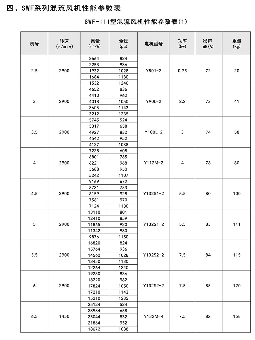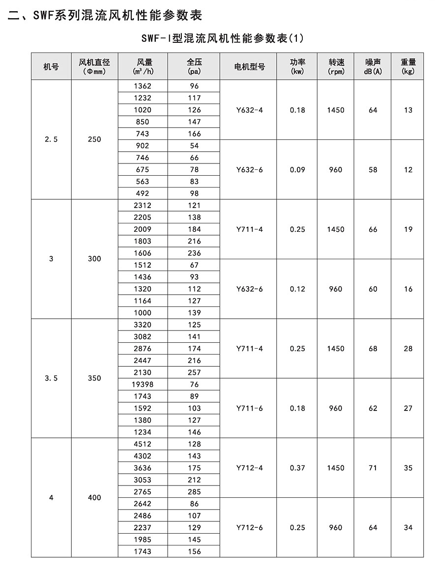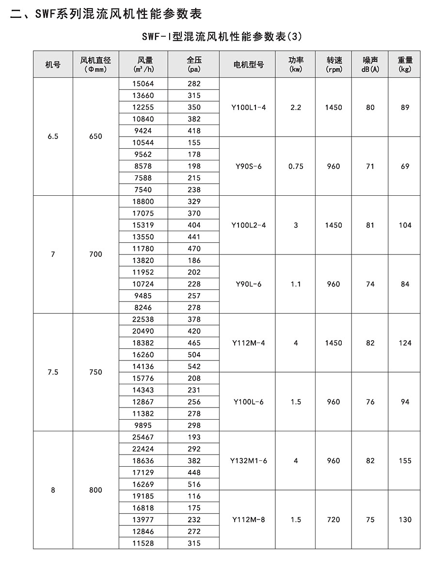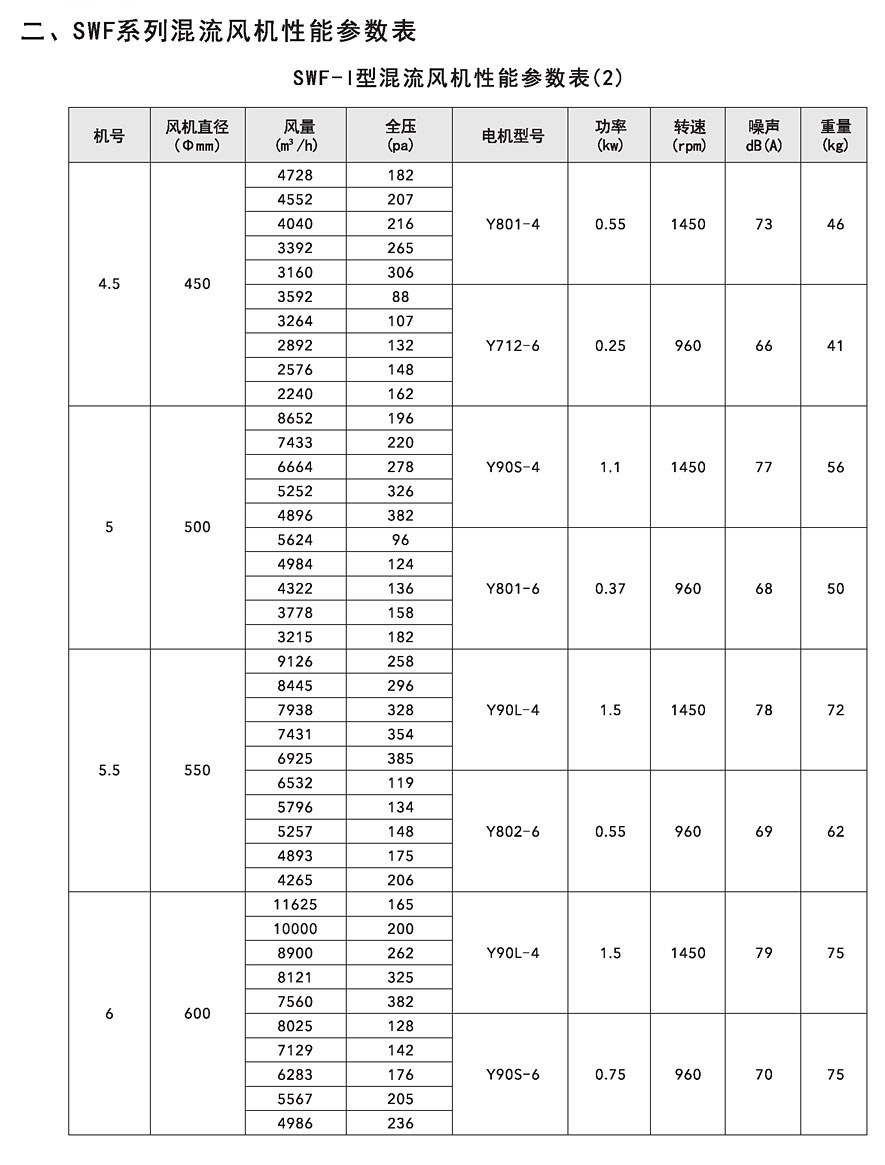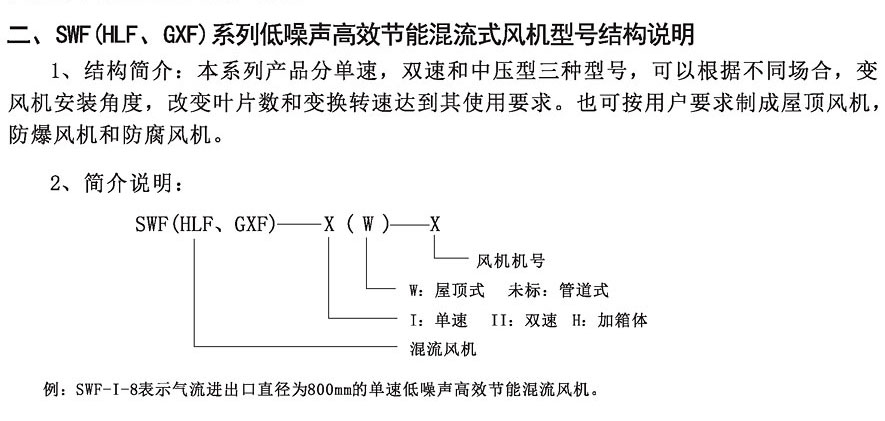 SWF系列風(fēng)機應(yīng)用子午加速方法和“準三元”流動理論設(shè)計,采用直線形外筒、錐形輪轂、扭曲翼形葉片、進風(fēng)口加置集流器或弧形消音器的結(jié)構(gòu)形式。壓力教同機號軸流風(fēng)機高,風(fēng)量較同機號離心風(fēng)機大。具有效率高、結(jié)構(gòu)緊湊、噪聲低、體積小、安裝方便等優(yōu)點。其中雙速風(fēng)機可根據(jù)試用工況要求通過變速來調(diào)整所需風(fēng)量、風(fēng)壓。