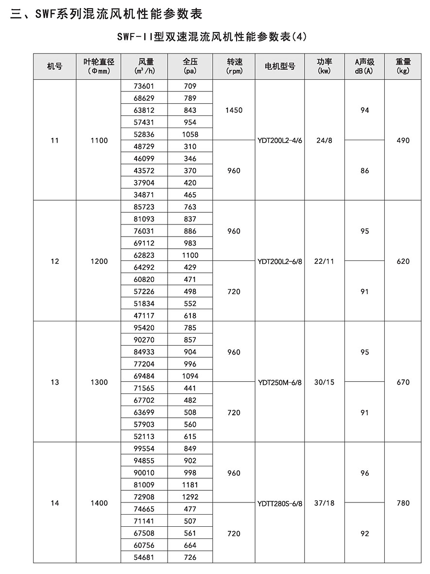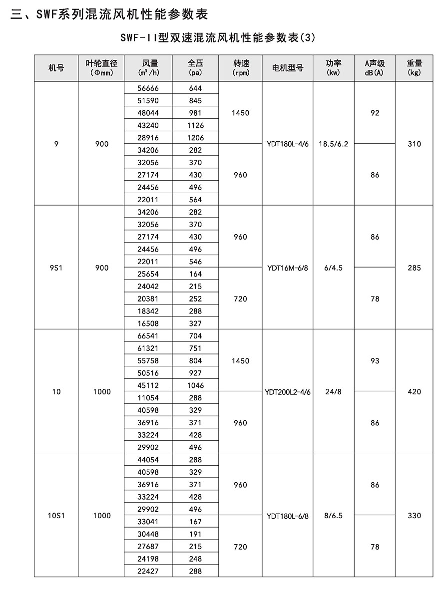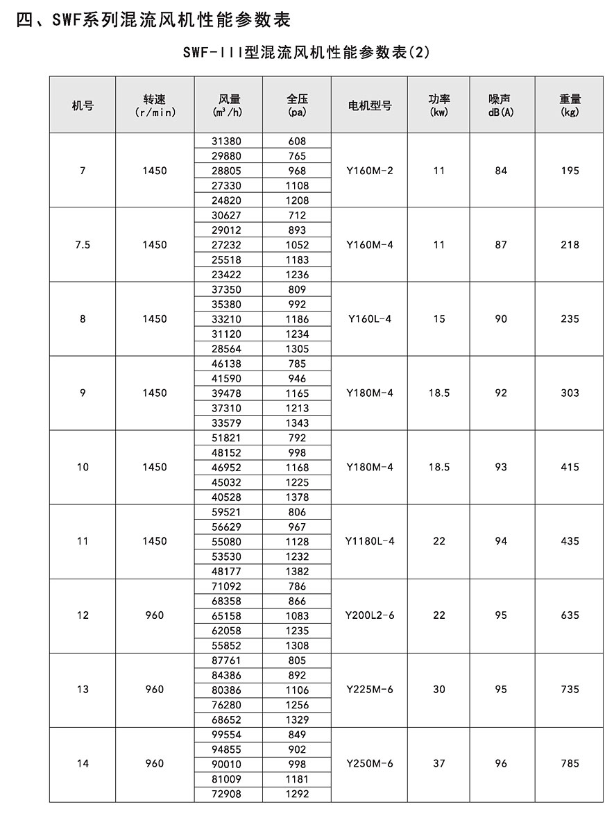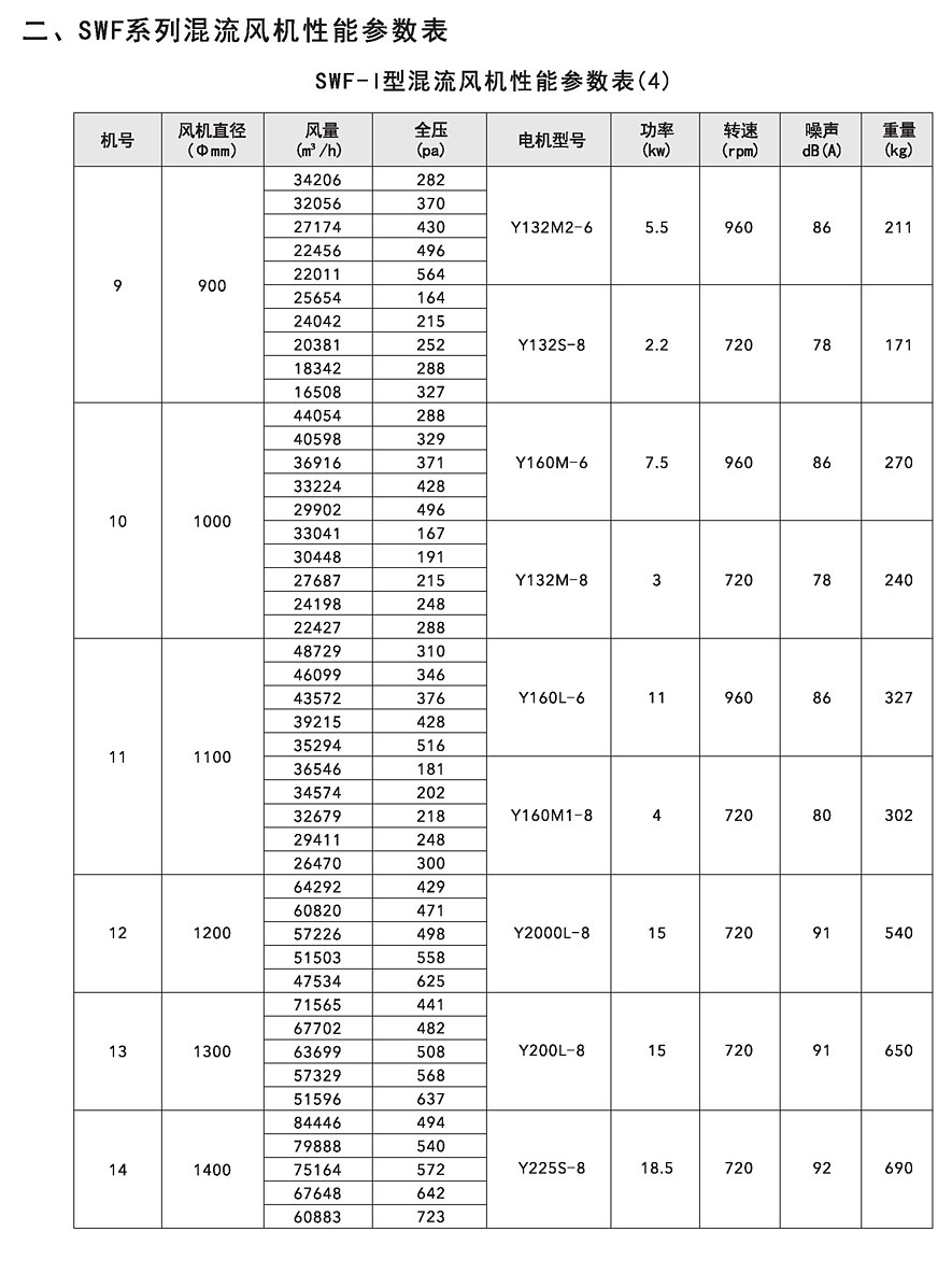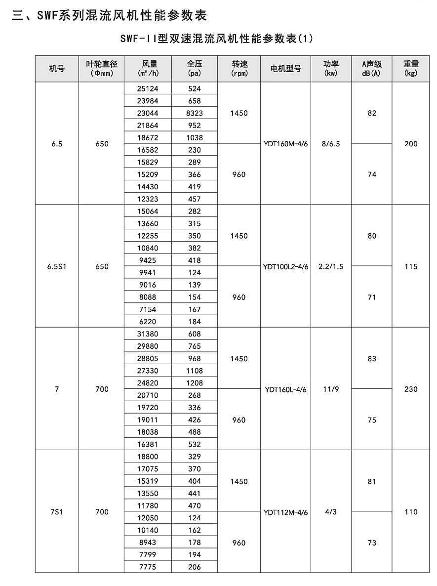 SWF系列風(fēng)機應(yīng)用子午加速方法和“準三元”流動理論設(shè)計,采用直線形外筒、錐形輪轂、扭曲翼形葉片、進風(fēng)口加置集流器或弧形消音器的結(jié)構(gòu)形式。壓力教同機號軸流風(fēng)機高,風(fēng)量較同機號離心風(fēng)機大。具有效率高、結(jié)構(gòu)緊湊、噪聲低、體積小、安裝方便等優(yōu)點。其中雙速風(fēng)機可根據(jù)試用工況要求通過變速來調(diào)整所需風(fēng)量、風(fēng)壓。
