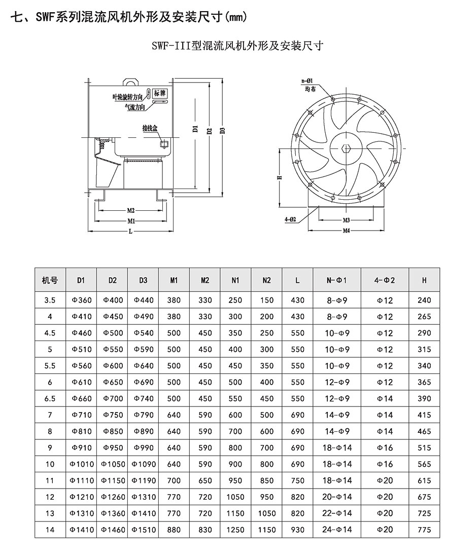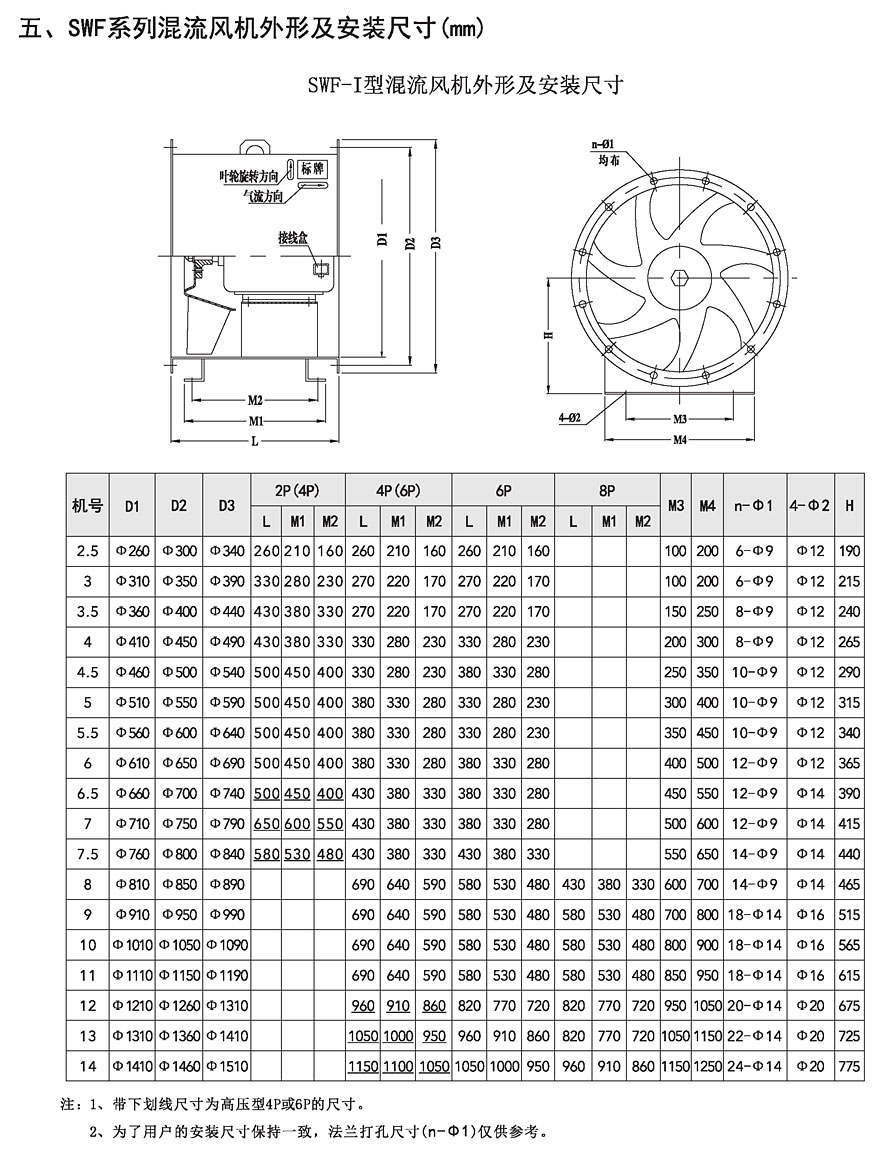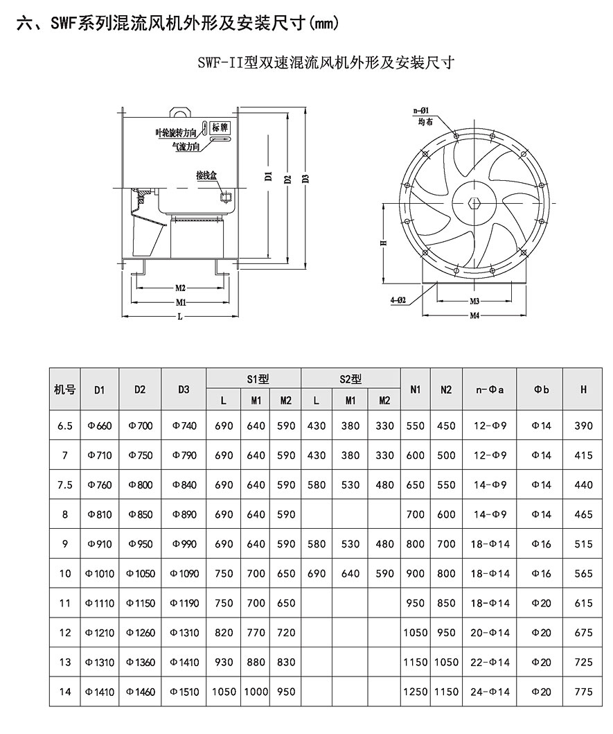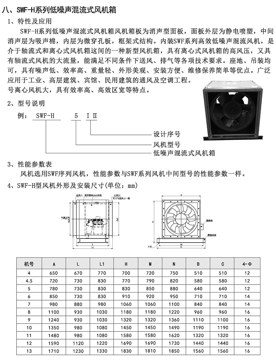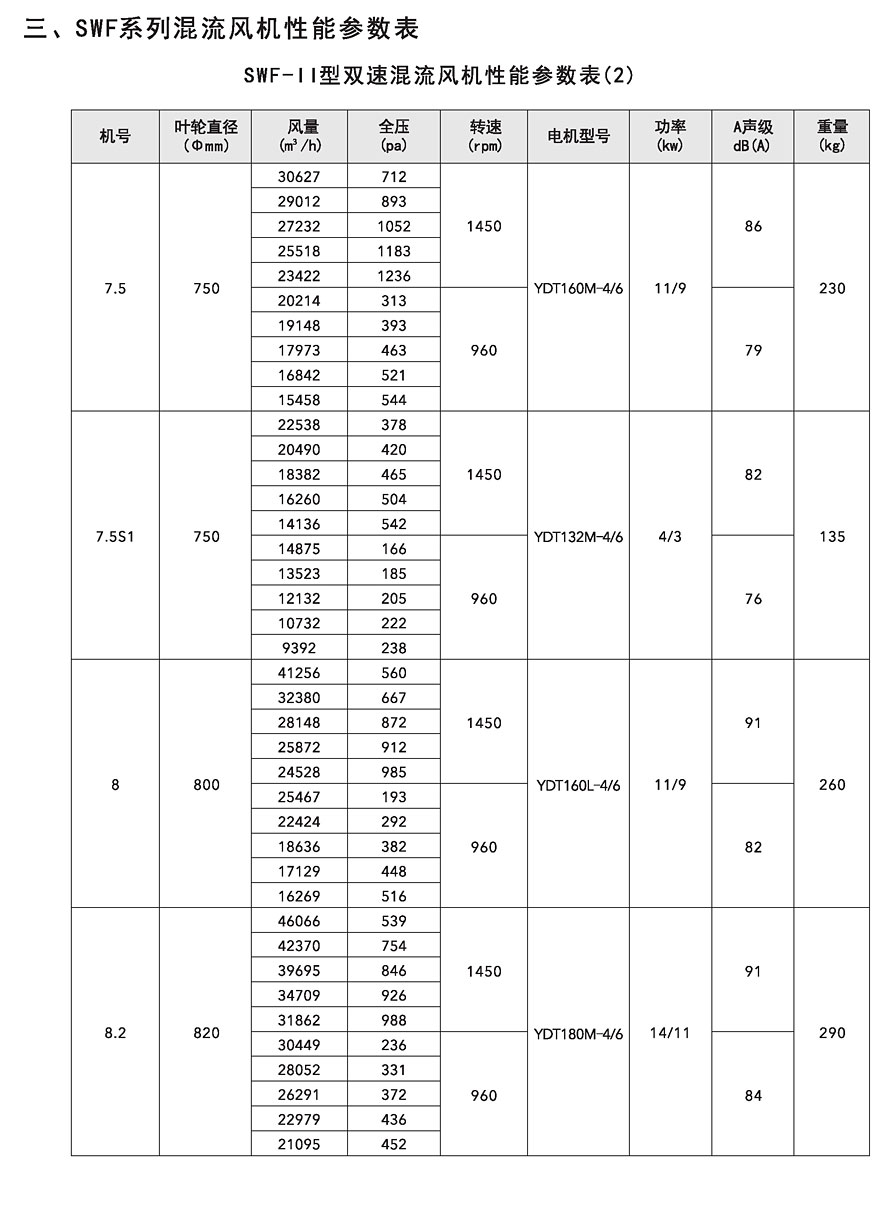 SWF系列風(fēng)機應(yīng)用子午加速方法和“準三元”流動理論設(shè)計,采用直線形外筒、錐形輪轂、扭曲翼形葉片、進風(fēng)口加置集流器或弧形消音器的結(jié)構(gòu)形式。壓力教同機號軸流風(fēng)機高,風(fēng)量較同機號離心風(fēng)機大。具有效率高、結(jié)構(gòu)緊湊、噪聲低、體積小、安裝方便等優(yōu)點。其中雙速風(fēng)機可根據(jù)試用工況要求通過變速來調(diào)整所需風(fēng)量、風(fēng)壓。